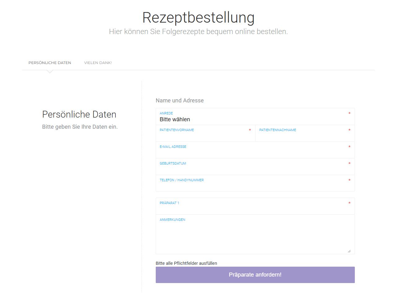 Des Weiteren bieten wir Ihnen die Möglichkeit, Ihre Rezepte bequem online zu bestellen. Mit unserem Online-Rezeptbestellungs-Service sparen Sie sich den mehrfachen Weg in die Praxis während eines Quartals und können Ihre Rezepte ganz einfach von zu Hause oder unterwegs anfordern. Nachdem Sie Ihr Rezept über unser sicheres Formular angefordert haben, kümmern wir uns umgehend um die Ausstellung.